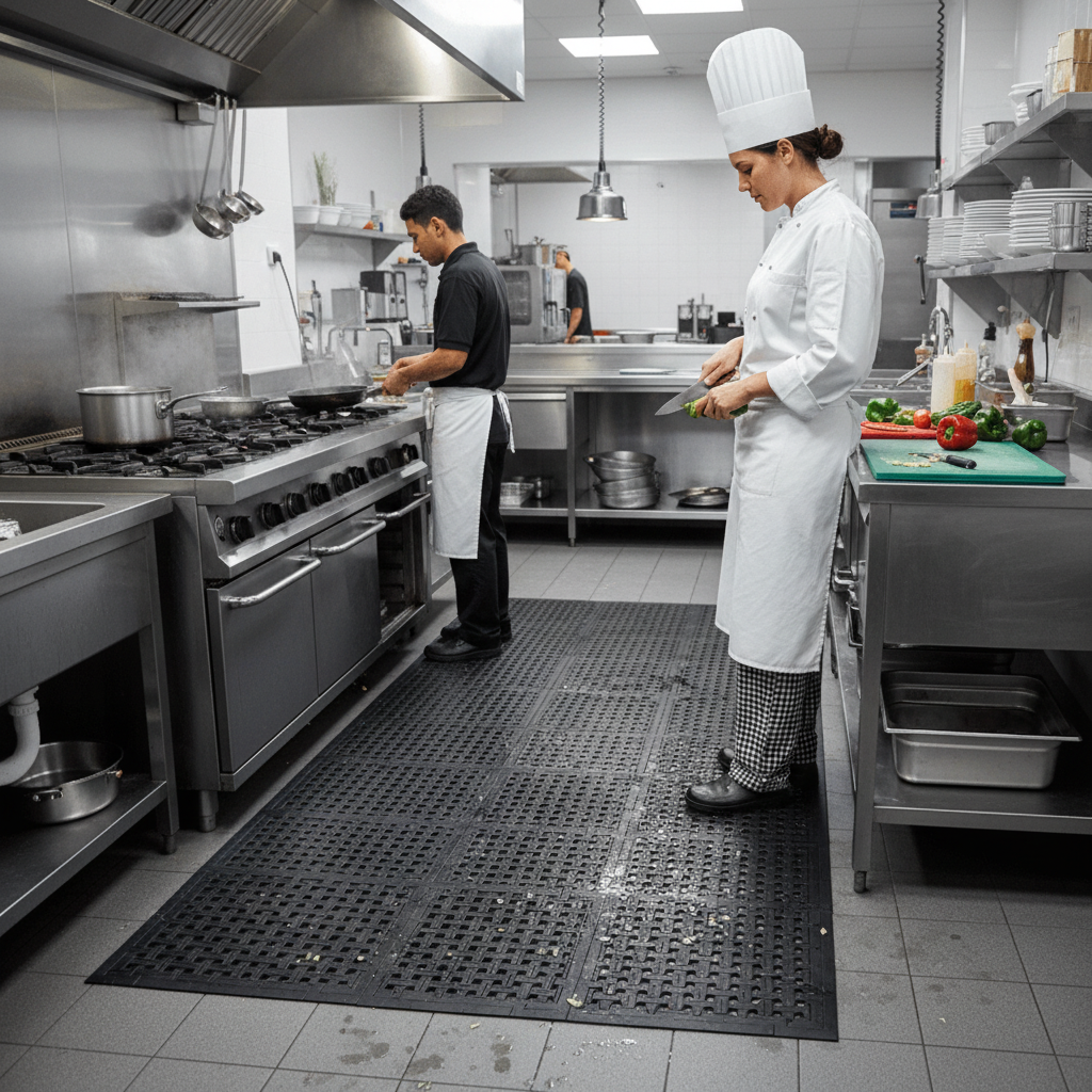 The Premium Anti-Microbial Comfort Rubber Mat is designed to provide unbeatable safety, hygiene, and comfort in demanding workspaces. Made from 100% nitrile rubber, this durable mat is perfect for professional kitchens, bars, wet workstations, and areas where prolonged standing occurs.